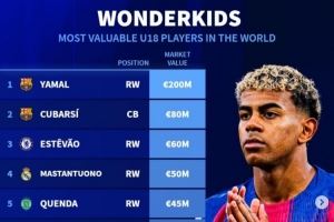 德转列U18身价榜:亚马尔、库巴西、埃斯特旺、马斯坦托诺列前四